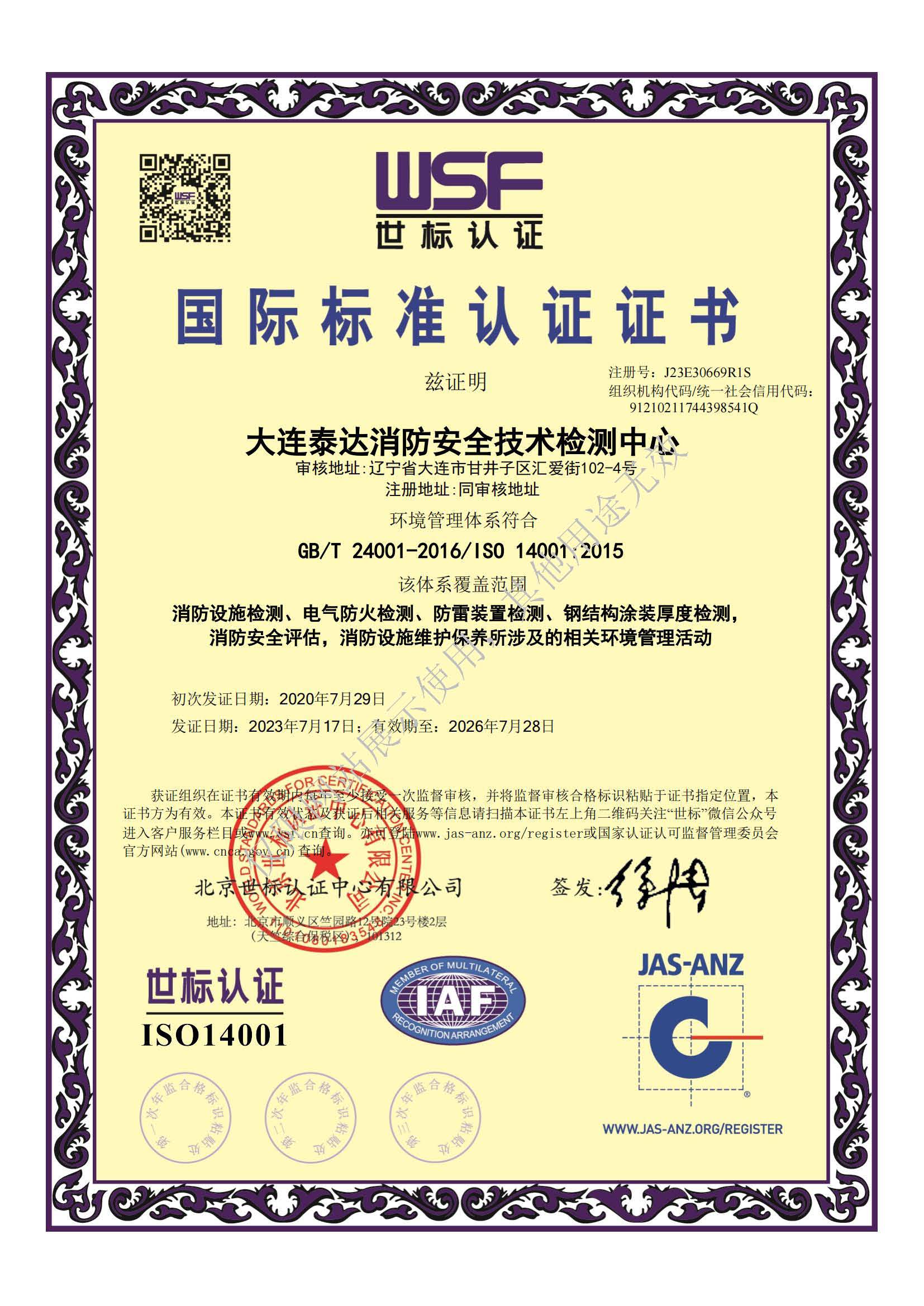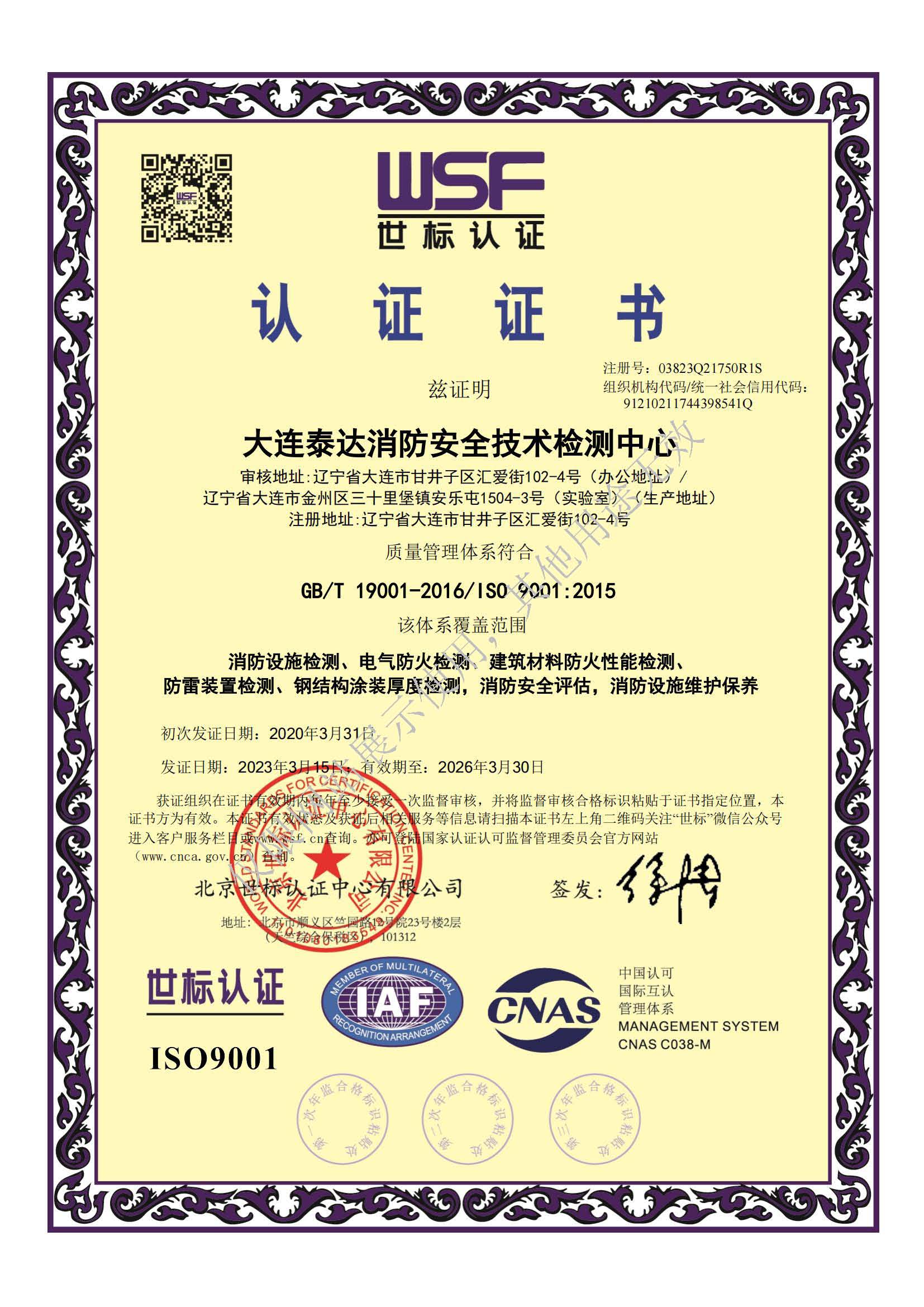 · 是經(jīng)“社會消防技術(shù)服務(wù)信息系統(tǒng)”備案并公示的消防技術(shù)服務(wù)機構(gòu),已取得中國氣象局頒發(fā)的雷電防護裝置檢測資質(zhì)證書、遼寧省質(zhì)量技術(shù)監(jiān)督局審核批準(zhǔn)的檢驗檢測機構(gòu)資質(zhì)認(rèn)定證書(CMA)及包括消防檢測、電氣檢測、雷電防護裝置檢測、防火涂層厚度檢測等在內(nèi)的200余項檢驗檢測能力,取得大連市應(yīng)急管理局頒發(fā)的安全生產(chǎn)標(biāo)準(zhǔn)化證書,獲得質(zhì)量管理體系、環(huán)境管理體系、職業(yè)健康安全管理體系認(rèn)證證書,是經(jīng)備案的高新技術(shù)企業(yè),可獨立出具具有證明作用的檢測報告。